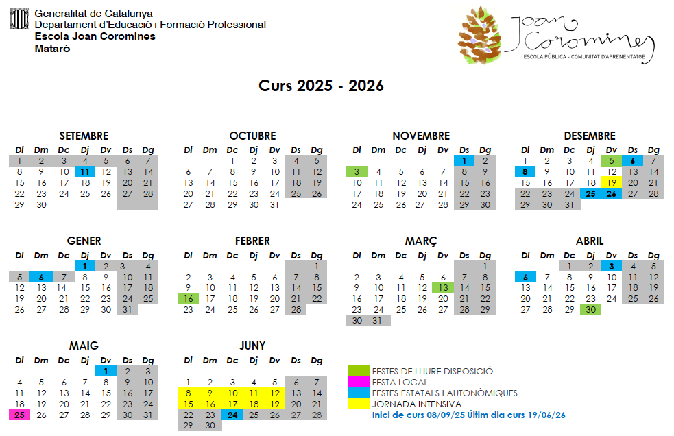 PDF icon Acta Plenari 3r Trimestre (20maig2025), PDF icon Acta Assamblea AFA (12novembre2024), PDF icon Oferta Inicial de Places 2025-2026, PDF icon Barem Provisional (24/04/2025), PDF icon Barem Resoltes les Reclamacions (05/05/2025), PDF icon Llista d'Espera 2025-2026, PDF icon Llistes de Peticions Assignades 2025-2026, PDF icon CALENDARI ESCOLAR 2025-26