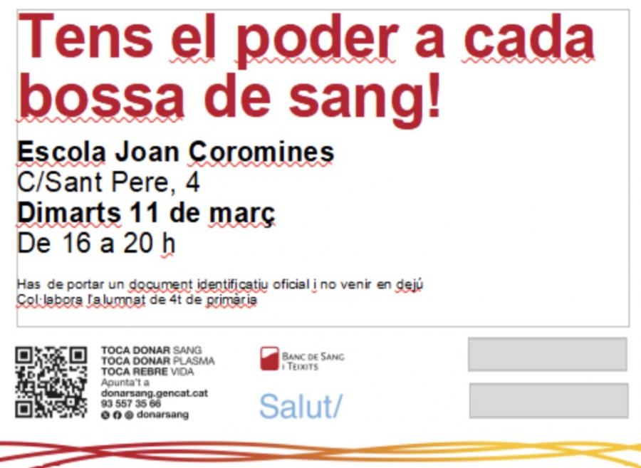 Els infants de 4t de primària estan organitzant una donació de sang que es realitzarà el Dimarts 11 de març 2025 a l'edifici de primària de l'escola.